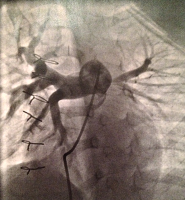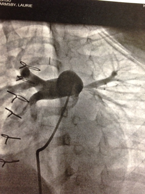 Here is a photo from her balloon dilation that Dr. Armsby performed in September that shows normal blood flow to her right lung (shown on the left in the photo), and diminished blood flow to her left lung: